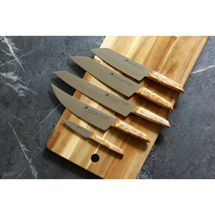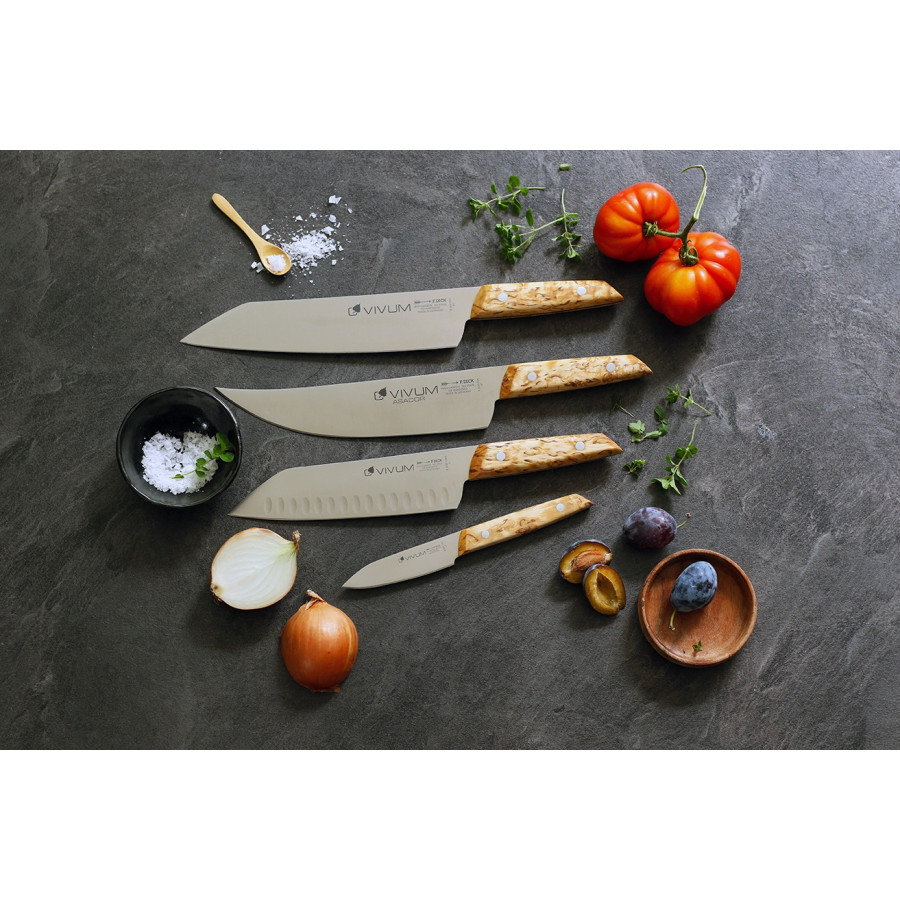 Nože F. Dick zo série VIVUM kombinujú tradičné remeslo s moderným dizajnom. Vyznačujú sa mimoriadne ostrou čepeľou, ergonomickou drevenou rukoväťou a precíznym spracovaním. Sú ideálne pre každodenné varenie aj profesionálnu kuchyňu.